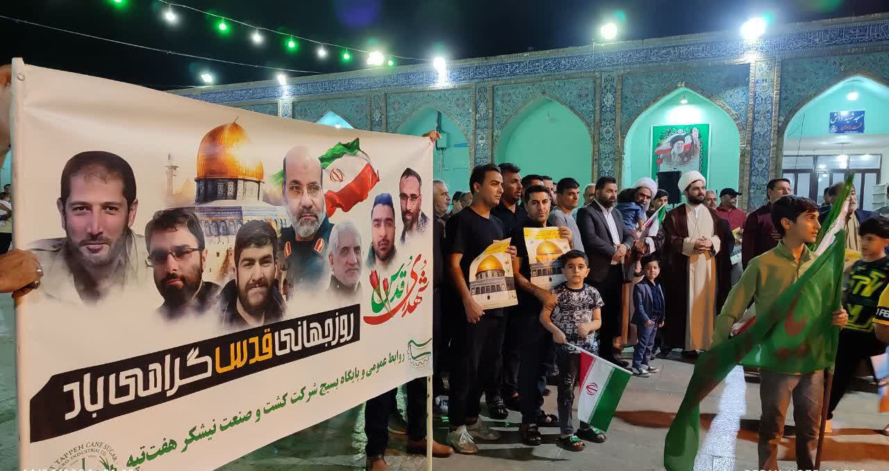 خانواده بزرگ شرکت نیشکر هفتتپه در این تجمع همگام با دیگر اقشار مختلف مردم شریف و نجیب ایران اسلامی ضمن تجدید میثاق با آرمانهای امام راحل و شهدای والامقام، با فریاد مرگ بر اسرائیل، جنایات این رژیم خبیث را محکوم کردند.