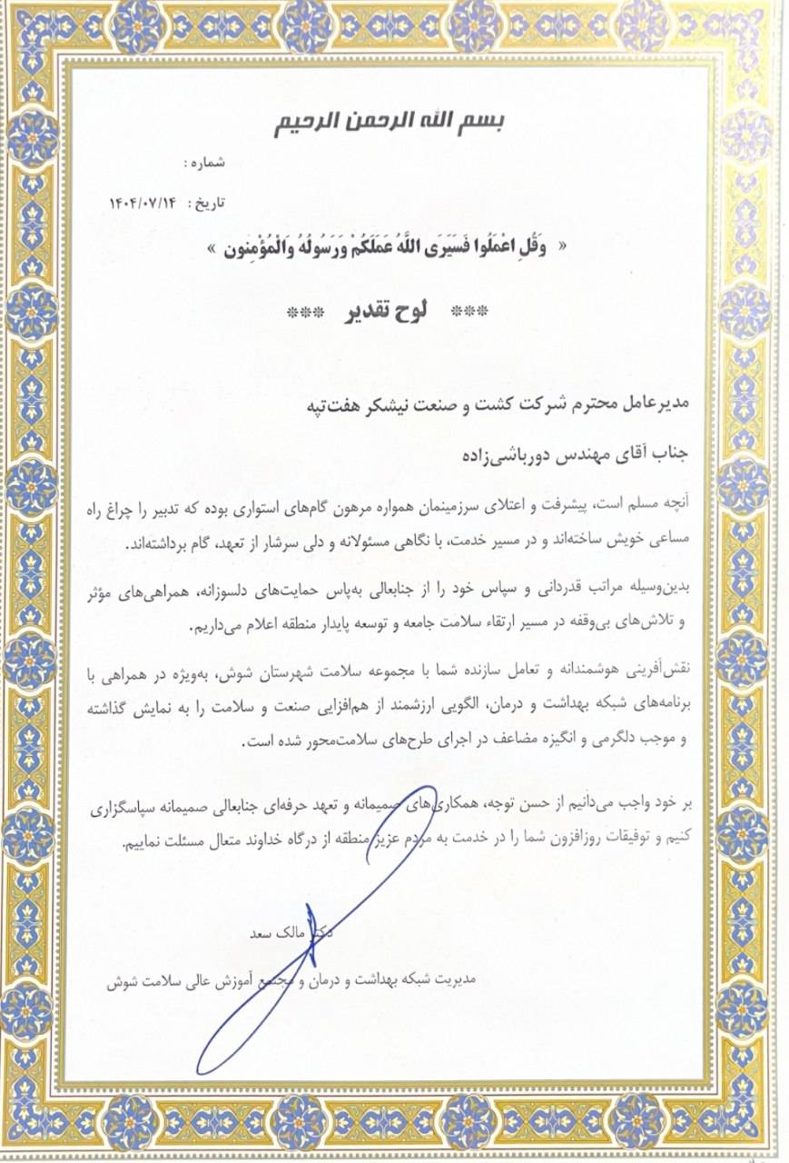 تجلیل مدیر شبکه بهداشت و درمان شوش از مدیرعامل شرکت نیشکر هفتتپه/ دکتر مالک سعد: اقدامات و گامهای مهم مدیریت هفتتپه جهت ارتقای سلامت کارکنان این شرکت قابل تقدیر است
