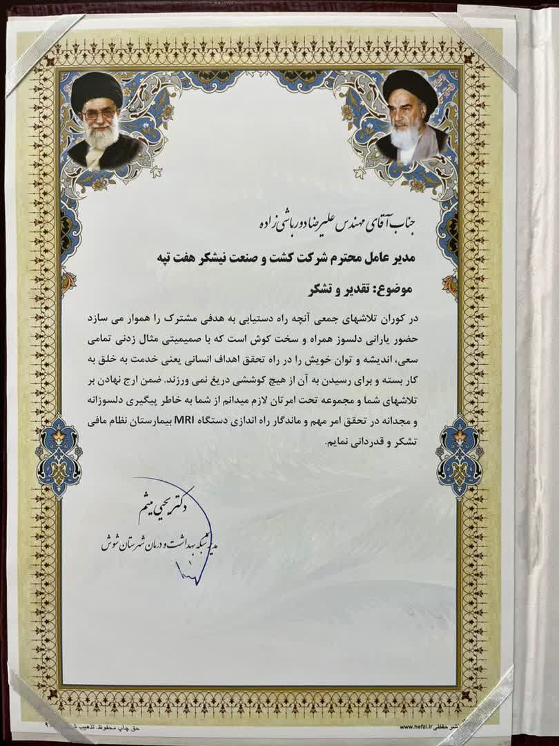 تجلیل مدیر شبکه بهداشت و درمان شوش از مدیرعامل شرکت نیشکر هفتتپه جهت همکاری در راهاندازی نخستین دستگاه MRI در شهرستان شوش