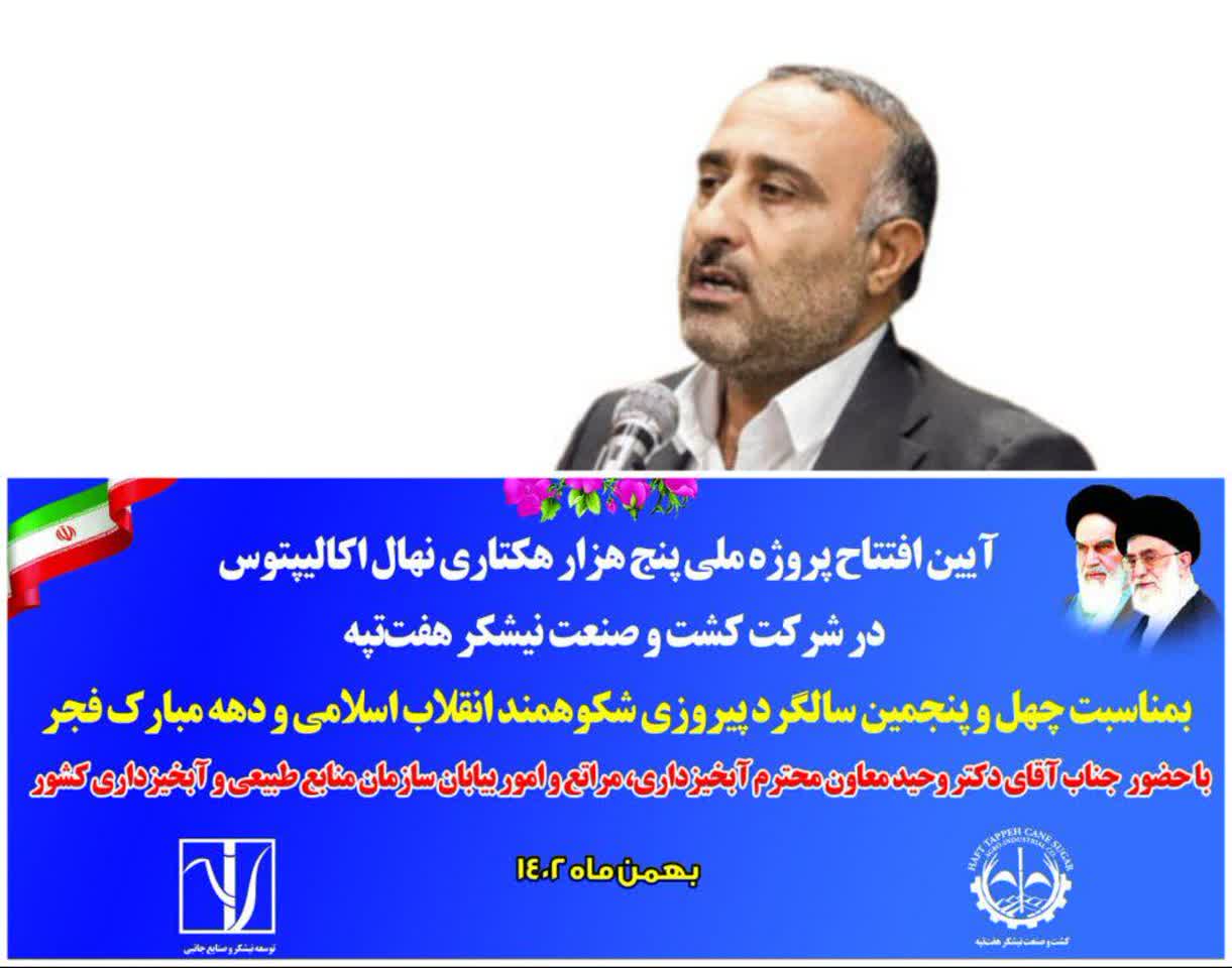 دکتر سیدجمال موسویان مدیرکل منابع طبیعی استان خوزستان ضمن تقدیر از زحمات مدیرعامل و کارکنان شرکت نیشکر هفتتپه جهت اجرای پروژه ملی و بزرگ کاشت پنج هزار هکتاری نهال اکالیپتوس بیان داشت: در ایام الله دهه مبارک فجر افتتاح پروژه ملی کاشت پنج هزار هکتاری نهال اکالیپتوس در شرکت کشت و صنعت نیشکر هفتتپه را به فال نیک میگیریم.