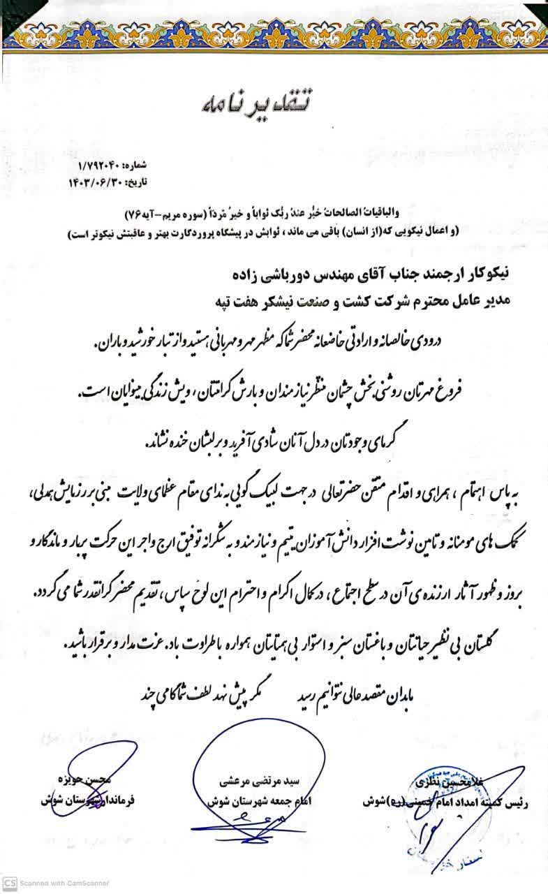 در پایان این مراسم، از طرف کمیته امداد شهرستان شوش با اهدای لوح تقدیر از حمایتهای جناب آقای مهندس دورباشیزاده مدیریت محترم عامل و رئیس هیئت مدیره شرکت کشت و صنعت نیشکر هفتتپه از مقوله مسئولیتهای اجتماعی و توجه به مناطق کمبرخوردار در اهدای بستههای لوازم التحریر تجلیل بعمل آمد.