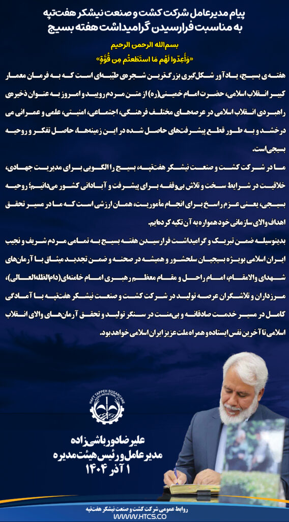 پیام مدیرعامل شرکت کشت و صنعت نیشکر هفت‌تپه به مناسبت فرارسیدن گرامیداشت هفته بسیج