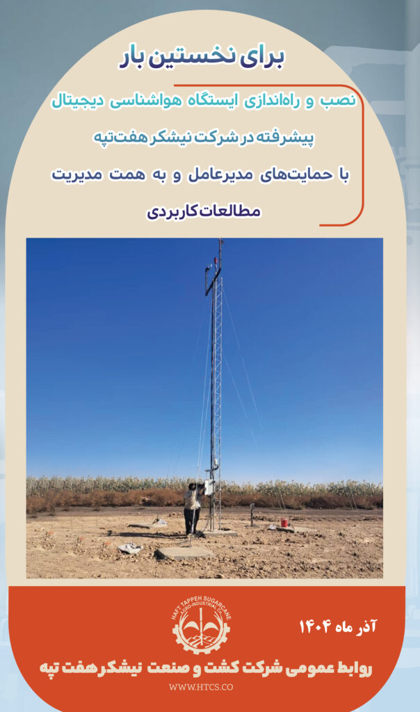 نصب و راهاندازی ایستگاه هواشناسی دیجیتال پیشرفته در شرکت نیشکر هفتتپه برای نخستین بار با حمایتهای مدیرعامل و به همت مدیریت مطالعات کاربردی این شرکت